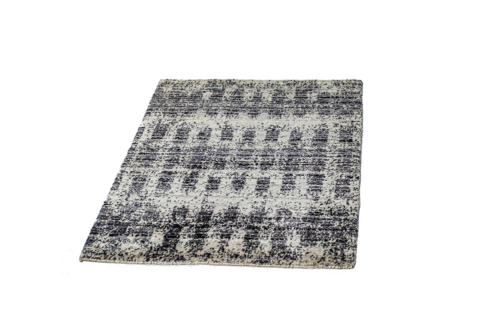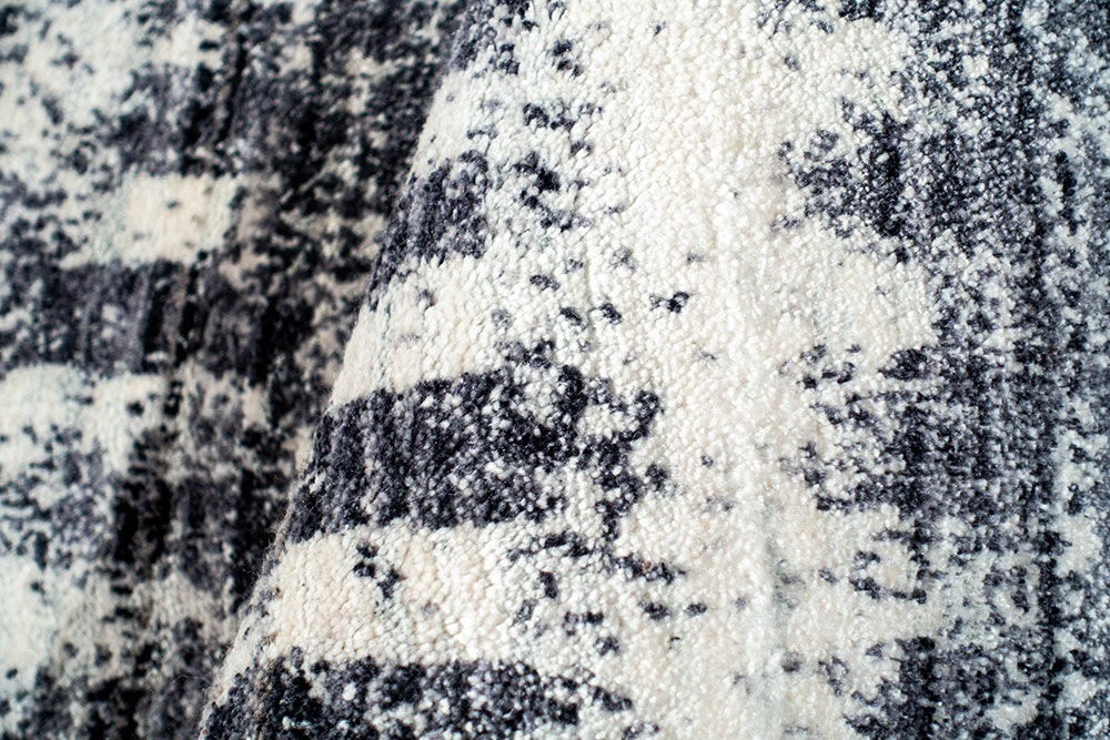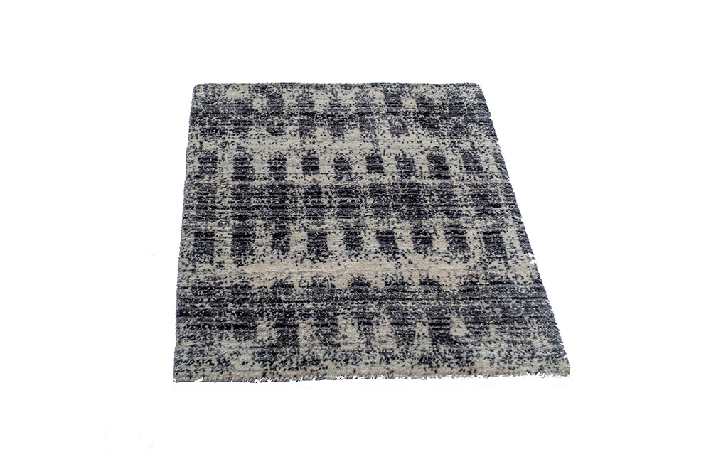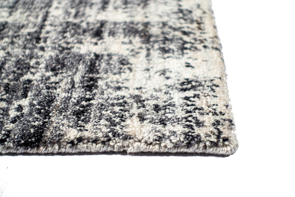 Tappeto moderno di piccole dimensioni con Fondo in lana color grigio chiaro con disegno lavorato a punta di forbice in seta di bambù color grigio scuro.